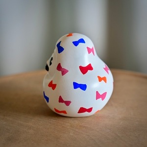 こちらはそのsuzunagaさんが発起人となった白ひゃくまんさんの作家さん絵付けバージョン。casa ruaでおなじみの村田菜穂美さんの一点ものです。小さなリボンが白地に映えてとても愛らしい仕上がりに。オブジェ、お守りとしてリビングとしてお楽しみください。
