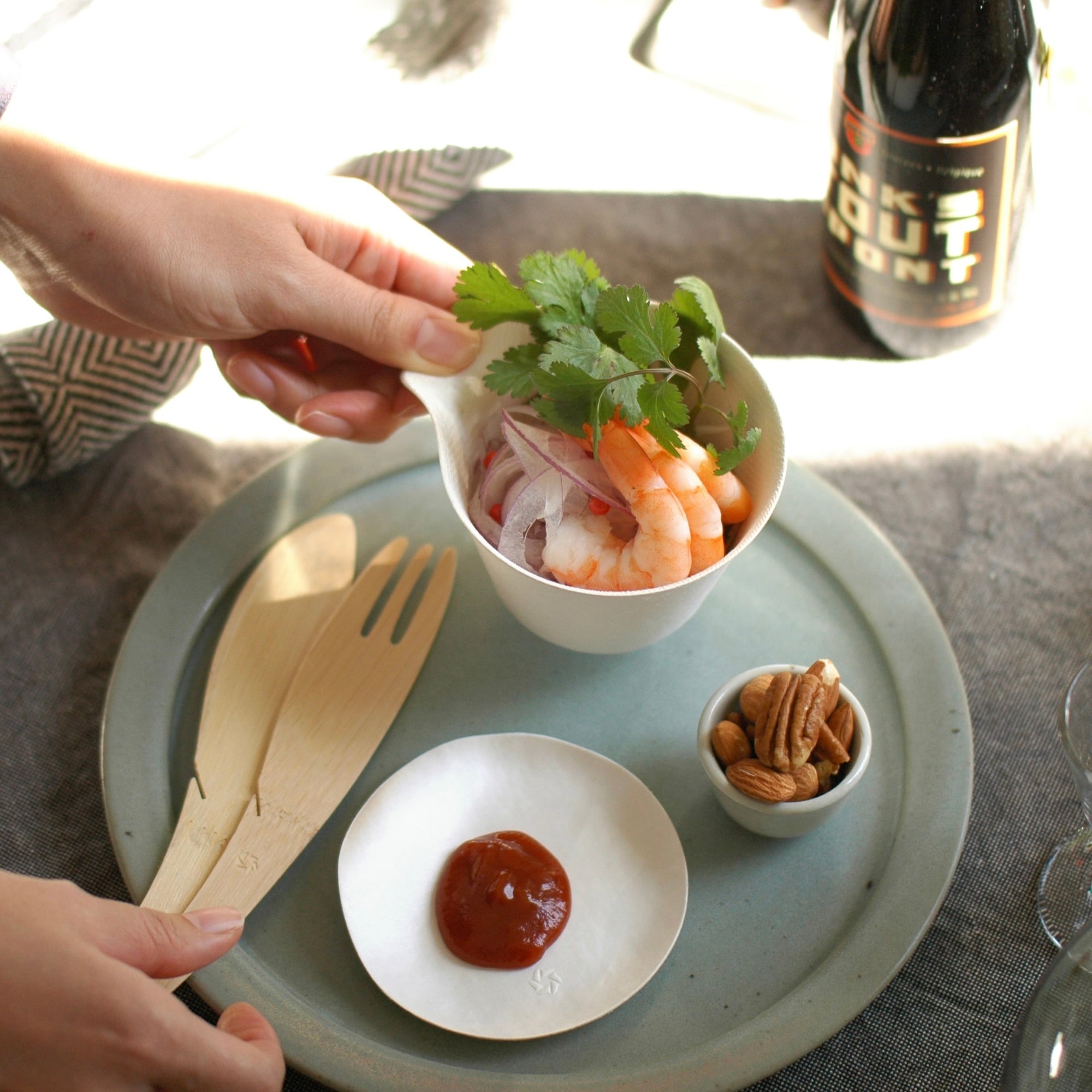 料理に合わせて器を選ぶことは日本人にとってごく自然な行為です。こんなにも器に気を配る文化は、おそらく他にはないでしょう。例えば日本には、ごはん茶碗やみそ汁椀などの専用の器がある一方で、酒器や小鉢としても使われる蕎麦猪口のような万能な器もあります。日本の器文化を表現するWASARAの使い方は自由自在。耐水・耐油性も備え、さまざまなアレンジをすることができ、もてなしの時間を素敵に彩ります。