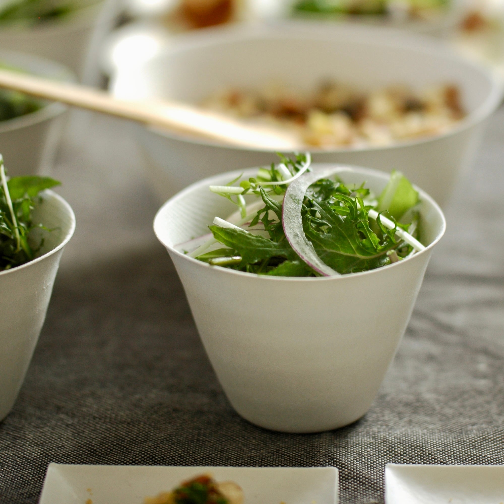 料理に合わせて器を選ぶことは日本人にとってごく自然な行為です。こんなにも器に気を配る文化は、おそらく他にはないでしょう。例えば日本には、ごはん茶碗やみそ汁椀などの専用の器がある一方で、酒器や小鉢としても使われる蕎麦猪口のような万能な器もあります。日本の器文化を表現するWASARAの使い方は自由自在。耐水・耐油性も備え、さまざまなアレンジをすることができ、もてなしの時間を素敵に彩ります。