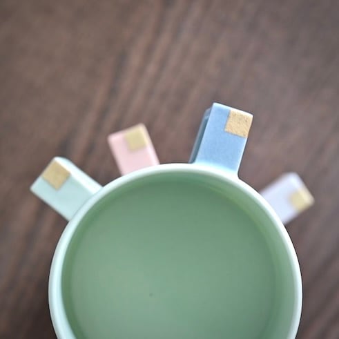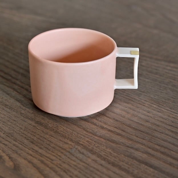こちらの飯碗も模様など装飾は一切ありませんが、持ちてのクールな四角さと優しい色合いが、とっても素敵。新しいカクカクカップは持ち手の角に箔が施されています。