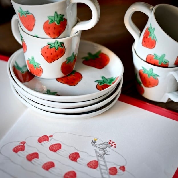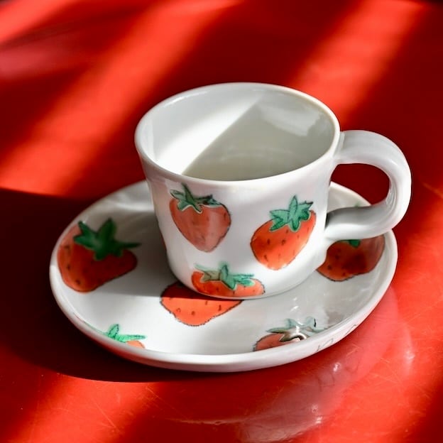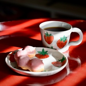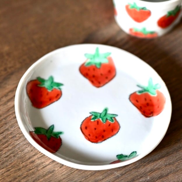 人気のいちごシリーズの丸おやつ皿です。ぺたっとしていてとっても使いやすいついつい手を伸ばしてしまう毎日の器です。かわいいおやつタイムに。