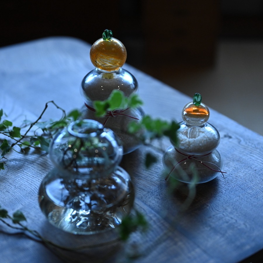こちらは石川県加賀市在住の秋友伸隆さんのガラス作品。20年以上も前に発表した当初から多くの方に愛されている鏡餅です。水引部分や中に入れる素材を、個々のアレンジで楽しむこともできます。商売繁盛を願って、カフェではコーヒー豆、お豆腐屋さんでは大豆、酒屋さんでは、お酒をいれたりと、店舗の飾りとしても様々に楽しむことができそう。