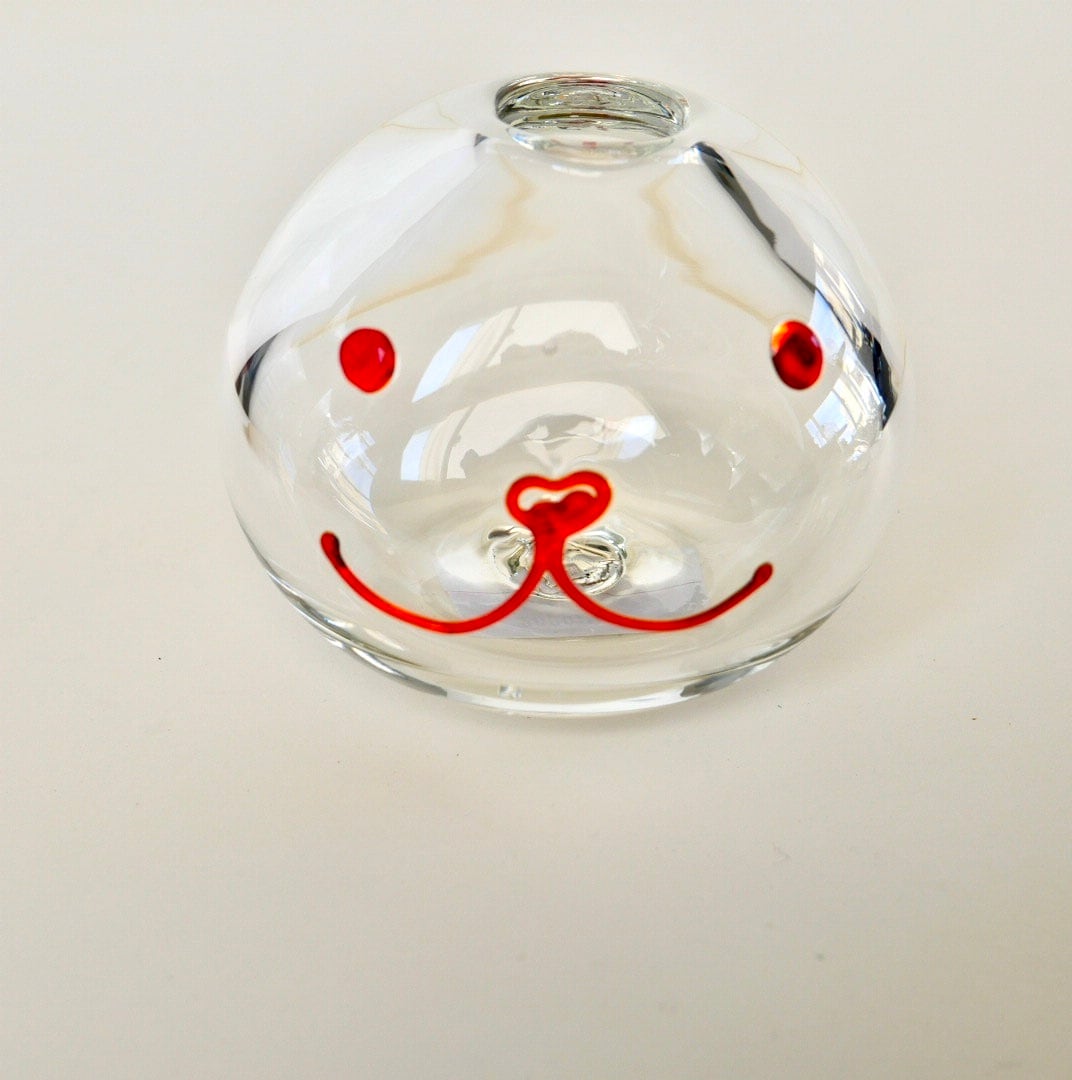 こちらは石川県加賀市在住の秋友伸隆さんのガラス作品。「そこにあるだけで、こころが和らぎ、使うたびに笑顔になる」そんな作品を作りたいと願いながらガラスを吹いているという秋友さん。ぬくもりと強さの両方を兼ね備えています。こちらの花瓶は、まさにこどもの透き通った動物の笑顔をモチーフにした作品です。小さな野の花や葉っぱを、頭からぴょこんと一輪でも飾ってあげれば、部屋が明るくなること間違いなしです。窓際、キッチン、お手洗いの片隅に。