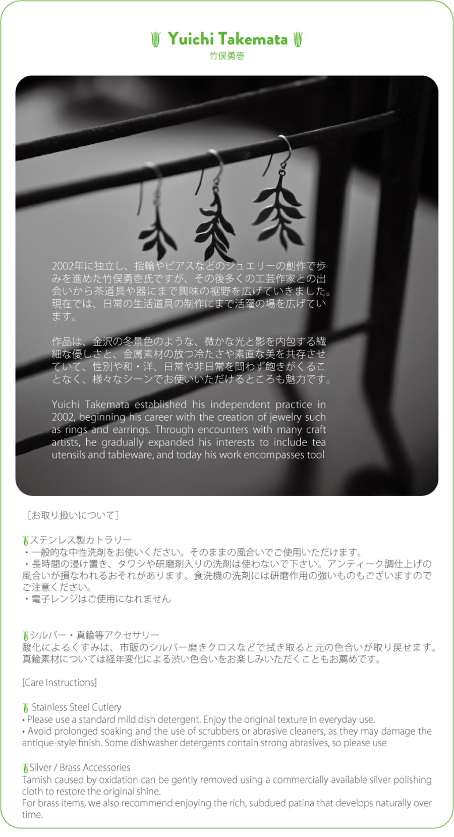 金沢の彫金師 竹俣勇壱氏の作る真鍮のアクセサリーは、金沢の冬の景色のような、微かな光と影を内包する繊細な優しさと、金属素材そのものの放つ冷たさの美を共存させています。性別を問わず身につけることができ、どんな洋服にも調和します。