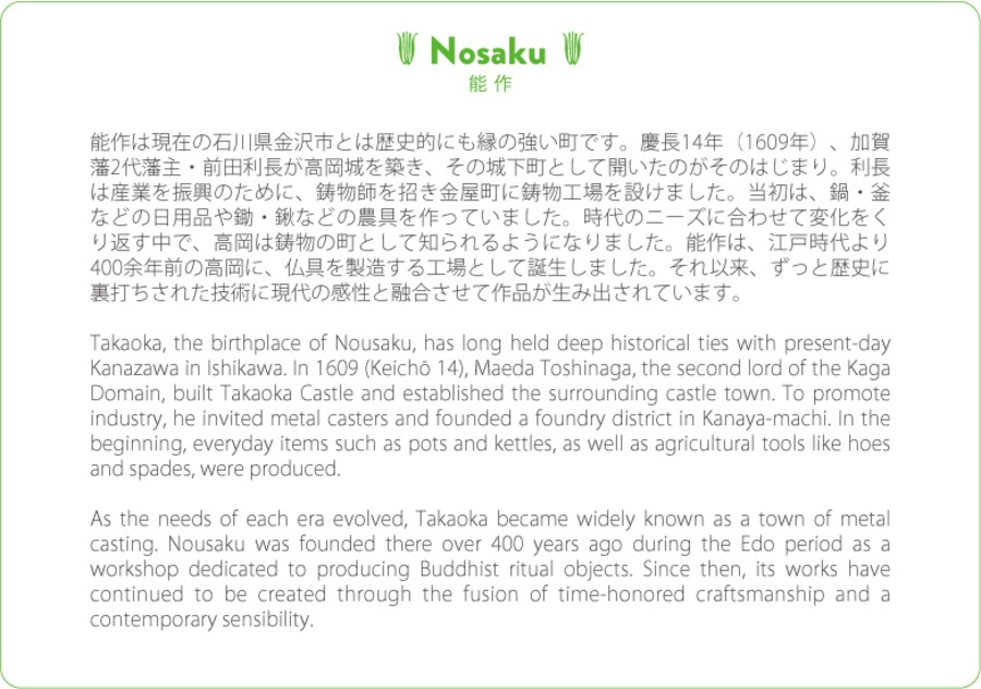 能作は現在の石川県金沢市とは歴史的にも縁の強い町です。慶長14年(1609年)、加賀藩2代藩主・前田利長が高岡城を築き、その城下町として開いたのがそのはじまり。利長は産業を振興のために、鋳物師を招き金屋町に鋳物工場を設けました。当初は、鍋・釜などの日用品や鋤・鍬などの農具を作っていました。時代のニーズに合わせて変化をくり返す中で、高岡は鋳物の町として知られるようになりました。能作は、江戸時代より400余年前の高岡に、仏具を製造する工場として誕生しました。それ以来、ずっと歴史に裏打ちされた技術に現代の感性と融合させて作品が生み出されています。