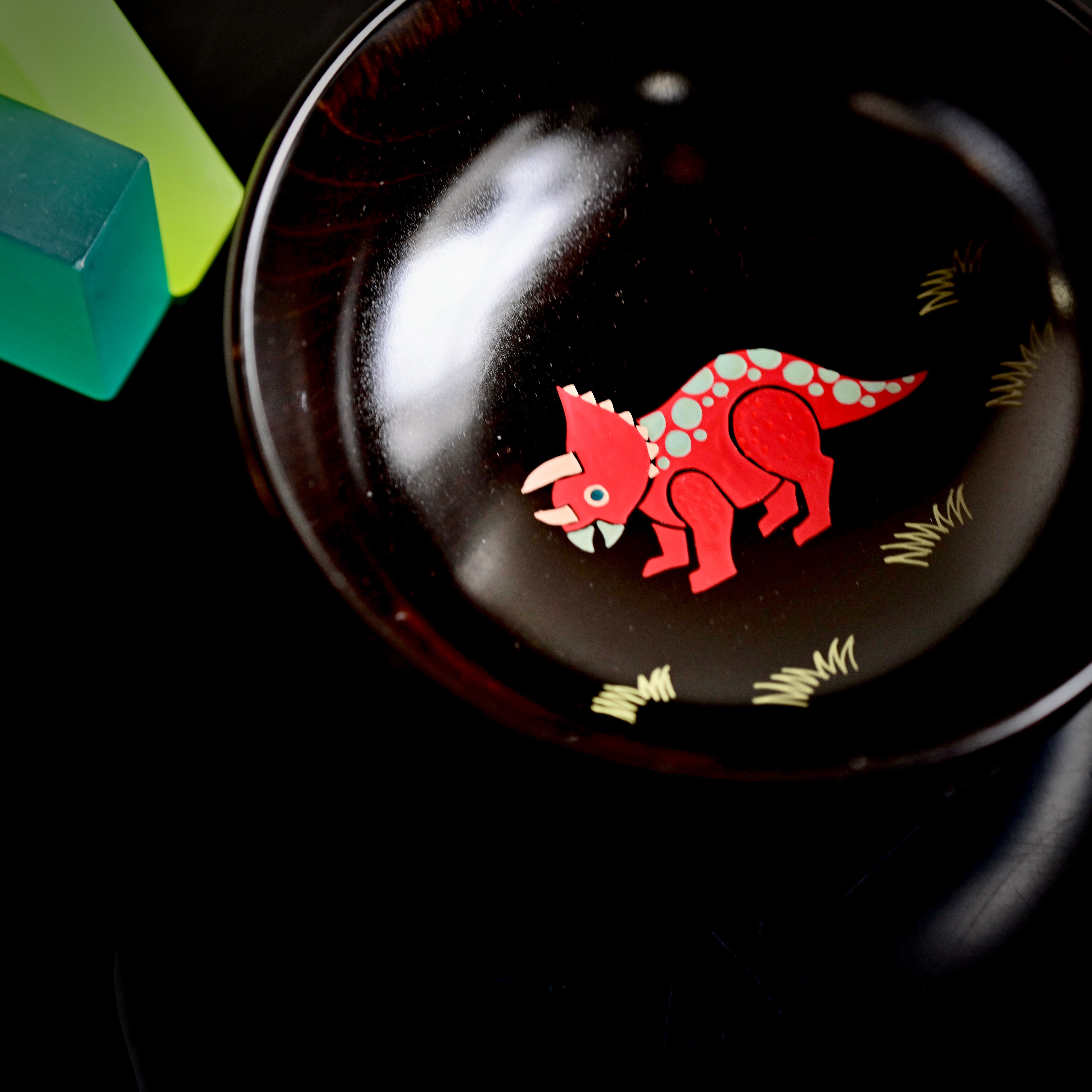 恐竜の美しい絵柄が描かれた飯碗です。丈夫なので、子供使いにもふさわしいのが漆器の良さ。プレゼントにも。